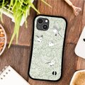 ウィリアム・モリスの「飛燕草」という絵柄を背景にシマエナガを舞い遊ばせたデザインのiPhoneケース。