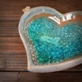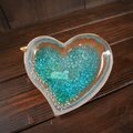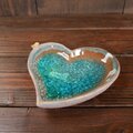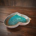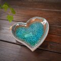 浅いみずたまりの様にガラスが溶け込んだハートの形の小皿です。縁には小鳥がとまっています。ガラスの向こうに自由に遊ぶ猫の影がぼんやりと透け見えます。