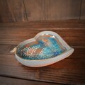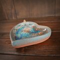 浅いみずたまりの様にガラスが溶け込んだハートの形の小皿です。縁には小鳥がとまっています。ガラスの向こうに自由に遊ぶ猫の影がぼんやりと透け見えます。