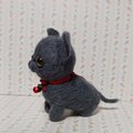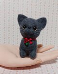 手のひらサイズのグレーの羊毛フェルト猫、鈴付きの赤いリボンが特徴。