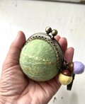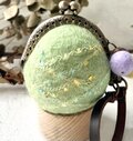 手のひらサイズの球体の羊毛フエルトがま口で、バックの外付けができるタイプです。