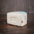 四角く突き固めた土から制作しています。中をくり抜き一旦ふたをしてから小さく口をあけています。模様を象嵌した後、赤や青の色土や釉薬を荒く施し、時が経過した様な、おぼろげな記憶の中にある様な雰囲気を表現しました。本焼成後に小鳥とや扉等に金液を施し低温で焼き付けました。