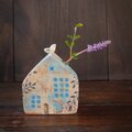 小鳥が屋根にとまった一輪挿しです。時を経た様な野性的なテクスチャー。気ままに現れるブルーが印象的に映えます。