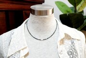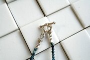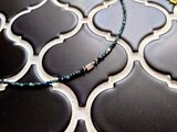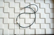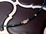 ネックレス部分にはインディゴライトトルマリン(ブルーグリーントルマリン)を使いました。とても細かい2mm玉、カットがほどこされていますので、実寸よりさらに小さく見えるかと思います。チェーン感覚でおつけいただけます。