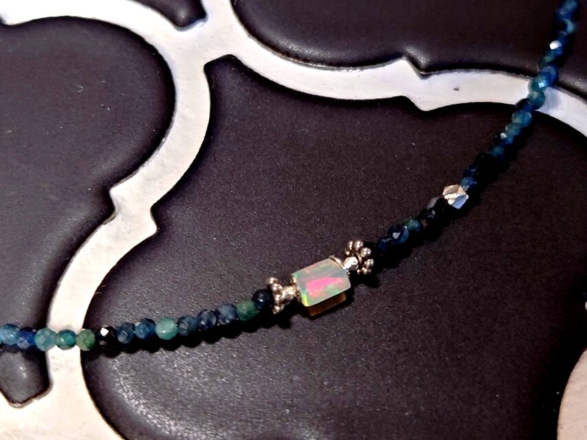エチオピア産オパールを1粒(長さ5ミリ程度)アクセントにしたネックレスです。とても小さな石ですが、光を受けて緑や赤色の輝きが浮かび上がって来ます♪オパールの両サイドにはシルバービーズを配しています。