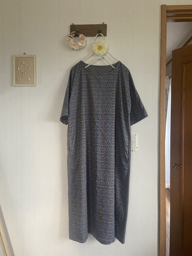 ・前見頃はHOKKOHの肌触りの滑らかなプレミアムコットンローンです。濃グレー地に小花柄が散りばめられた涼しげで素敵な生地です。後ろ見頃はスワニープロデュースの濃グレーのシルキーコットンでさ。