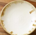 器のアクセントとして縁に飴色の釉薬をかけたことにより、流れるような模様が描き出されています。