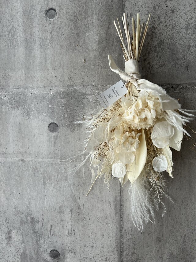サイズ約45×20㎝(最長部分)色々な白を楽しむためのお花です。白は何色にも染まる柔軟でおおらかだから、少しでも癒される時間につながれば嬉しいです。少し散りばめたゴールドのかすみが上品な仕上がりに。あまり変化しにくいのでゆっくり色んな季節をお楽しみください。適した環境は涼しめの光が当たりにくい暗い場所が1番いい状態を長く保ちます。次に日陰です。イタリア産のアザミを使用しています。