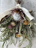 サイズ約55×40㎝ボリュームたっぷりのスワッグ。キングプロテアやアーティチョークやドライアンドラなど迫力ある花材を合わせました。プリザーブドフラワーとドライフラワーを混ぜ合わせたスワッグです。前撮りなどにもお使いいただける花材を集めました。なるべく長く維持するドライフラワーを厳選していますが、時間経過によりいずれはドライフラワーの方から先に退色していきます。光や日差しが当たらない涼しい屋内の場所ですと、いい状態を保ちやすいです。お花が過ごしやすい場所に飾ってあげるのもいいのですが、1番飾りたい場所で飾っていただくのもいいかもしれません。