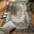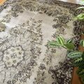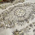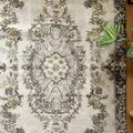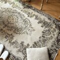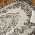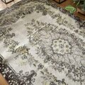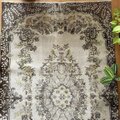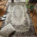 サイズは118×209cm、広めの空間にもしっくり馴染む、存在感あるトルコヴィンテージラグです。中央には王道のメダリオンが堂々と配置され、まわりを花や実のモチーフがぐるりと囲むクラシカルなデザイン。伝統的でありながら、色合いはとても新鮮で、グレーやベージュ、イエローにブラウンが絶妙に溶け合ったレアなカラーパレットになっています。