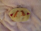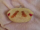 サイズは横約11センチ、縦約9センチ(がま口含む)です。地色は薄い黄色のビーズです。犬が向かい合っています。その横にハートを編みこんでいます。犬は両面で4匹。ハートは4個編みこんでいます。裏はつけていません。