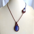 深みのある濃い藍色や淡い色の濃淡の中に、金色が輝くパイライトが内包された魅力的なアフガニスタン産ラピスラズリをメインに、首紐のサイドに青白く輝くブルーシラーが目を惹くスリランカ産ムーンストーンあわせた1点ものマクラメペンダントです。