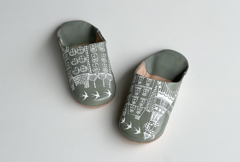 モロッコの伝統的な履物のバブーシュにわたしたちの大好きなパリの街をハンドペイントで描きました。