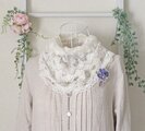 アンティーク風のモチーフレースの上にパンジーのお花を淡い紫のレース糸で編んだ細いひもで束ねて、ちいさなブーケのように仕立てました。