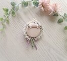 アンティーク風のモチーフレースの上に深みのある青紫色の刺繡糸で編んだパンジーのお花を淡い紫のレース糸で編んだ細いひもで束ねて、ちいさなブーケのように仕立てました。