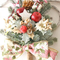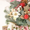 【使用花材】ポインセチア、リンゴ、松ぼっくり、クリスマスベル、クリスマスプレゼントほか
