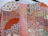 正絹の花柄の着物と菊の花の地模様入りの無地の着物を組み合わせて作りました。