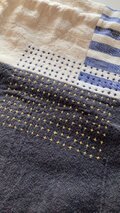 淡い黄色、ブルーとナチュラルカラーのリネンとコットンを組み合わせた巾着袋です。