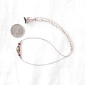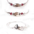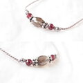 透明感のあるスモーキークォーツに真紅のガーネットを合わせ、シルバーのスペーサーとシルバー色のヘマタイトを添えてグレー色のシルクコードで繋いだ、輝きのある上品な雰囲気のショートネックレスです。