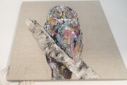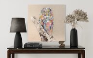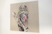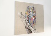 動物シリーズからフクロウのスプレーアート作品!知性や幸運の象徴でもあるフクロウを正方形キャンバスに表現した作品。キャンバスの質感をお洒落な感じに残し沢山の色を使って表現されたフクロウがかっこよくもあり、可愛らしい作品になっています。フクロウ好きには大変おすすめで、贈り物の絵としてもおすすめです。