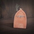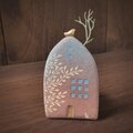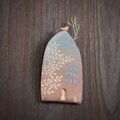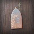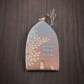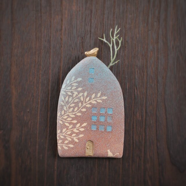 小鳥が屋根にとまったおうちの壁掛けです。赤土に少し曇ったブルーが優しい風合いになりました。
