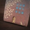 薄くスライスした陶土の板から制作しています。壁には葉模様と猫影を施しました。描いているのではなく白土で象嵌してあります。浅く彫った所に白土を押し込み平らに削るとシルエットが浮かび上がるのが作っていてとても楽しい所です。