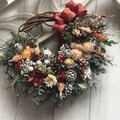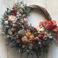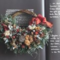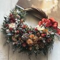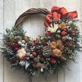 赤い木ノ実と真紅の鶏頭の花を散りばめアレンジされたリースで可愛いくセンスの良いステキなリースでした