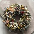 赤い木ノ実と真紅の鶏頭の花を散りばめアレンジされたリースで可愛いくセンスの良いステキなリースでした