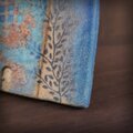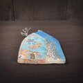 薄くスライスした陶土の板から制作しています。壁には葉模様と猫影を施しました。描いているのではなく黒土で象嵌してあります。浅く彫った所に生地土と違う色の土を押し込み平らに削るとシルエットが浮かび上がるのが作っていてとても楽しい所です。屋根や窓には濃さの違うコバルト土を塗ります。