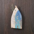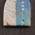 薄くスライスした陶土の板から制作しています。壁には葉模様と猫影を施しました。描いているのではなく黒土で象嵌してあります。浅く彫った所に生地土と違う色の土を押し込み平らに削るとシルエットが浮かび上がるのが作っていてとても楽しい所です。屋根や窓には濃さの違うコバルト土を塗ります。