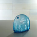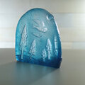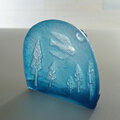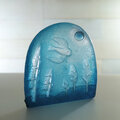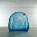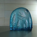 通常は レリーフのある凹凸面が表になっていますが、この作品は ガラスが溶けて平らな水面のようになっている側から ガラスの中の世界を覗くオブジェになります。