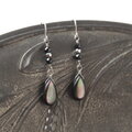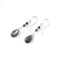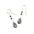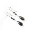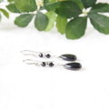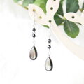 美しい照りが見られるスリムなペアシェイプ形状のブラックシェルにカットがキラリと輝くブラックスピネルを合わせ、アクセントにシルバー色のヘマタイトを添えたシックな雰囲気のピアスです。