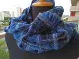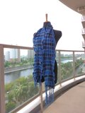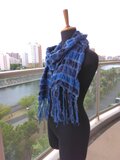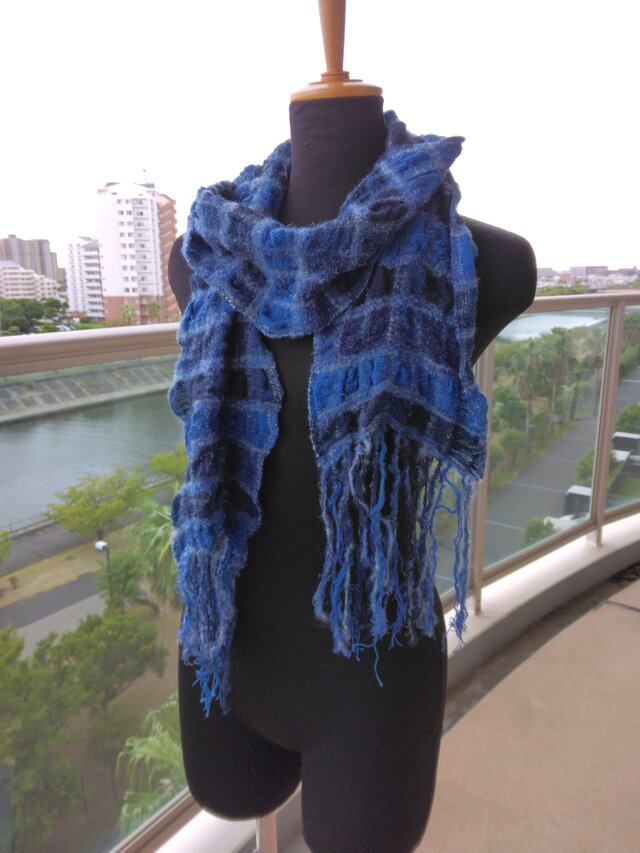 手織のマフラーです。ちじむ糸ちじまない糸がありますのでそこを利用しておりましたマフラーです。色合いは紺系統です。きれいなブルー、少し薄めの紺、紺の三種類のブルーを段染め糸が囲みます。段染め糸はちじみます。他のブルー系の糸はちじみません。そこでポコポコが生まれます。幅18センチ、長さ170センチ(房を含まず)、房8センチです。