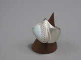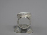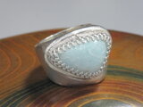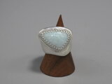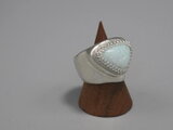 リングのサイズは13号強、重さは18g、最大幅は22mm、手のひら側は10mm、金属部分は純銀です。