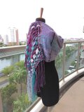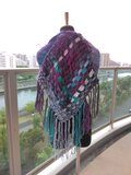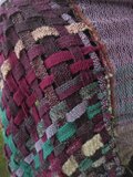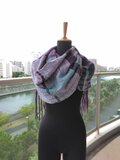 っていきます。首周りは二巻、突き合わせ部分は分け織りしたものを縦糸、横糸とみなして織り込みますのでボリュウムが出て、そこを前に、あるいは後ろへ、あるいは肩へ持ってくることで大変おしゃれな着方が出来ます。色合いは濃紫メインです。若草色を少々使いましたので全体に明るく仕上がりました。幅35センチ、長さは首に二巻。