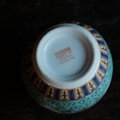 花唐草と漢字と蝙蝠◆萬寿無疆。中国景徳鎮 色絵蓋付壺 茶壷 ビビットグリーン ポップ チャイナレトロ