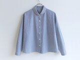小さめのヘチマカラーと前たてに並べた貝ボタンをアクセントに、シンプルなシャツに仕立てました。ワイドパンツやキュロット、ギャザースカートなどのボリューム感のあるボトムスにも合わせやすい、やや短めの着丈(58cm)です。ドロップショルダーのゆったりシルエットのシャツで、とてもリラックスした着心地ですが、3mm幅の青&白のストライプ柄がすっきりとした印象なので、どことなくきちんとした雰囲気もあります。