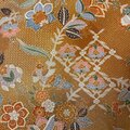 あたたかな金茶(柿色)の地に、細かな粒子がきらっと揺れる微塵柄。その上を、手描き風の花鳥文と花菱格子がリズミカルに連なります。
