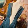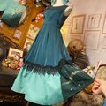 ドレス本体はつやを含んだピーコックグリーン。裾まわりには同系ミントの切替パネルを配し、ところどころに花びらと金砂の霞を散らして軽やかに。