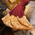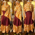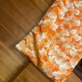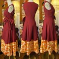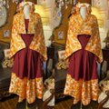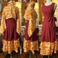 深いボルドーのワンピースに、柿~山吹を思わせる金橙の着物地を重ねた和モダンドレス。やわらかな光沢のある地色に、白~薄金の花葉が重なり合うレトロな意匠は、紅葉と花びらの間を揺れる秋の空気を閉じ込めたよう。あたたかく上品、でも可憐。そんな“秋の夕焼け”をまとえる一着です。