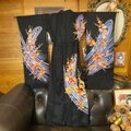 振袖ならではの伸びやかな絵羽柄を袖と裾に活かし、歩くたびに波紋のような動きが生まれて黒の艶と色彩のコントラストが際立ちます。
