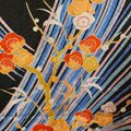 群青・瑠璃・水色・藤・薄桃の束ね熨斗風の流線が扇状に走り、金を含む枝に朱~金杏~白の梅が咲きこぼれる。夜空を切り裂く光跡に、香る梅が重なるドラマティックな意匠です。