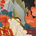 漆黒の黒留袖をリメイクした、凛として華やかなワンピース。藍~群青の流水がうねり、翡翠・若草の山並みが重なり、金砂子の霞がきらめく。その景色に、扇面へあしらった牡丹や菊、小花の束が咲きこぼれ、縁取りの金彩が光を拾います。