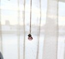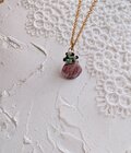 透明なマロンカットにワインレッドの斜めのストライプの美しいアンデシンです。今回は極小の中でも特に小粒のグリーン系のオパールを沢山配して、Quiet Robinのおなじみ、ジェムティアラペンダントに仕上げました。赤とグリーンのコントラストが美しいペンダントです。