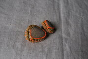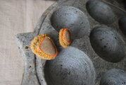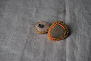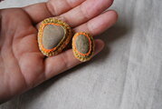 ころんとした石を刺繍で包み込んでピアスにしました。ラメの糸や光沢のあるコットンの糸、そして蛍光色のオレンジを石と組み合わせ、いろいろな系統のお洋服に合わせていただけそうです。