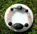 中心に30ミリx18ミリのオーバルドラゴンヴェインアゲート、12ミリのダークブルーアイオライトAAA級、10ミリのドラゴンヴェインアゲート、10ミリのレインボーオブシディアン、14ミリのキャッツアイを組ませました。