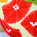 クリーム色地に扇型の花のような柄が描かれた着物をリメイクして作りました。