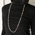 胸元にすっと伸びるラインに、柔らかいホワイトに近いブルー系を散りばめた天然石を連ねたロングネックレス。
