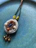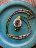 ペンダントトップには、ヴィンテージビーズと真鍮ビーズを縫い、占星術のホロスコープのようなイメージ。