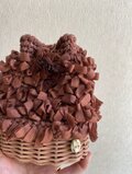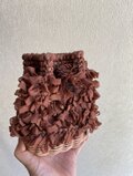 天然の籐を用いてカゴから編み、さらに上の編み部分はかぎ針編みで、フリルを一つ一つ指で作りながら編んでいます。